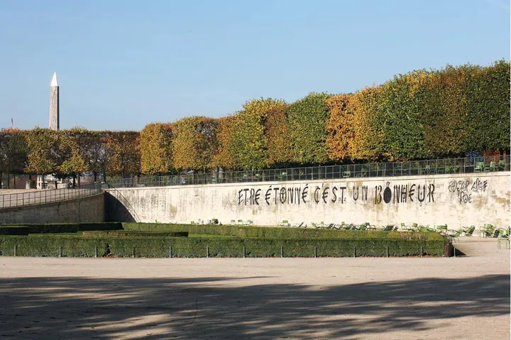Consider, for instance, the day he inscribed the words “To be astonished is a pleasure” by Edgar Allan Poe as a large graphic stencil installation on a wall in Paris’ Tuileries Garden in 2009 or the statement “Art is what helps draw us out of inertia” by Belgian writer Henri Michaux on the ground in front of the Grand Palais in 2016 during the FIAC international art fair in the French capital.
