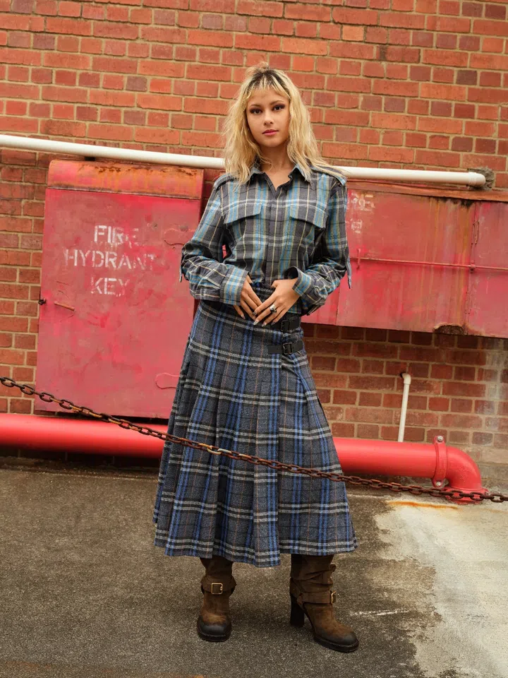 Melia wears cotton shirt, wool kilt with calf leather trim, and Stirrup suede boots, Burberry. Ring, subject’s own