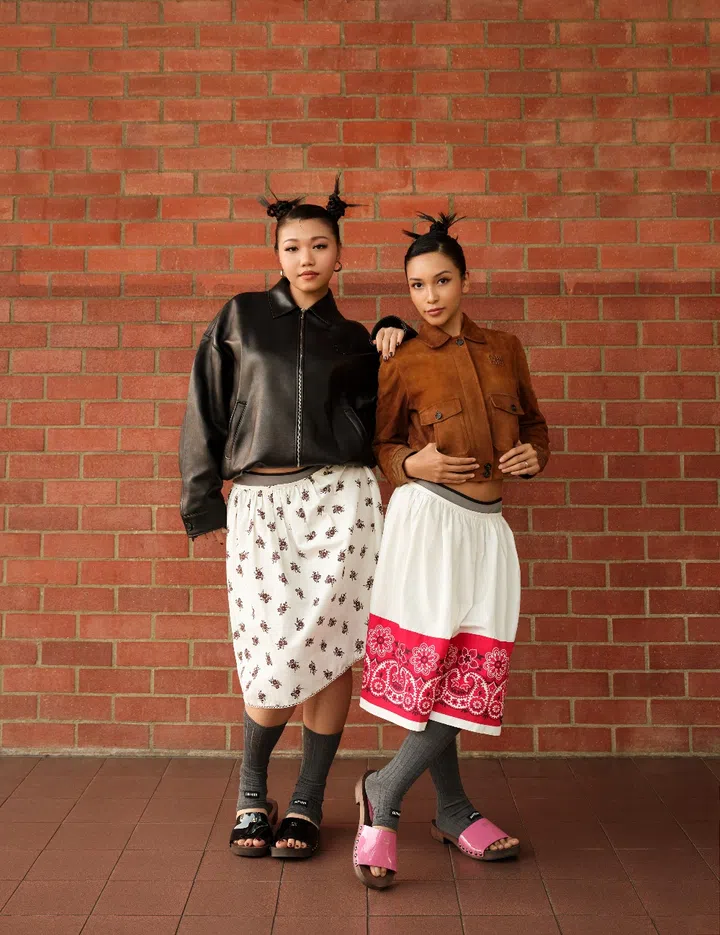 Angelina (left) wears plonge nappa lambskin jacket. Farah wears lambskin suede blouson. Worn on both: Slubbed poplin skirt, technical knit swimsuit bottom (worn under skirt), silk toeless socks and calfskin patent leather clogs. All Miu Miu. Earrings and ring, subjects’ own
