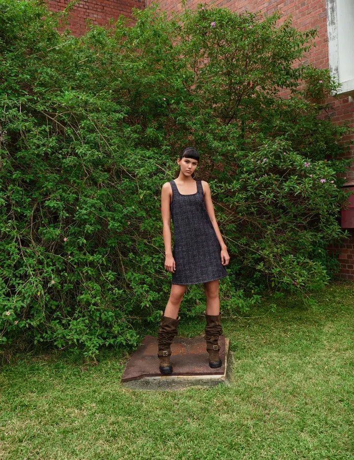 Alexandra wears denim dress, Horse Hoop metal earring (sold in a pair) and Stirrup suede boots, Burberry