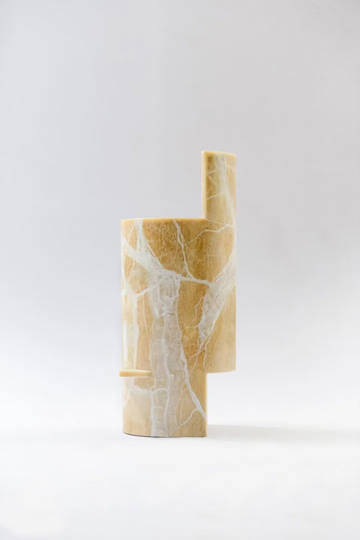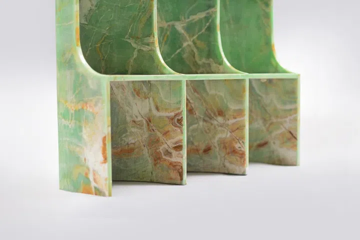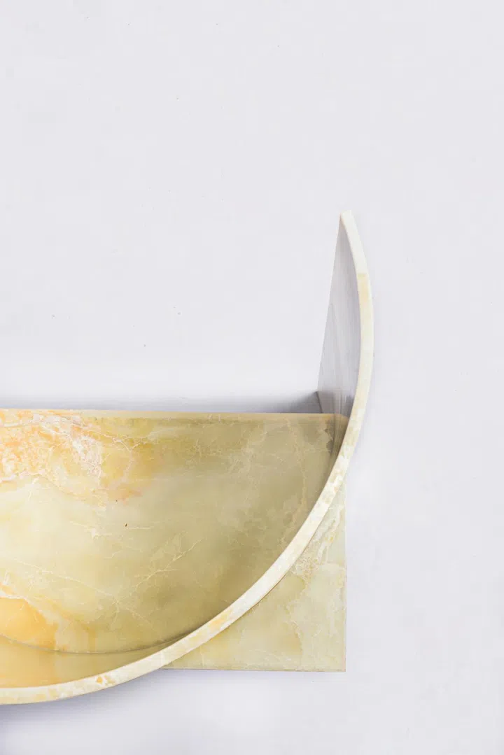 It turns out that Yong has collaborated with MM Galleri, an Indonesian stone specialist firm, to birth the uniquely organic shapes of the collection, through a patented technique where the material (in this case, onyx) is sliced into thin slabs, before using compression to bend them into molds.
