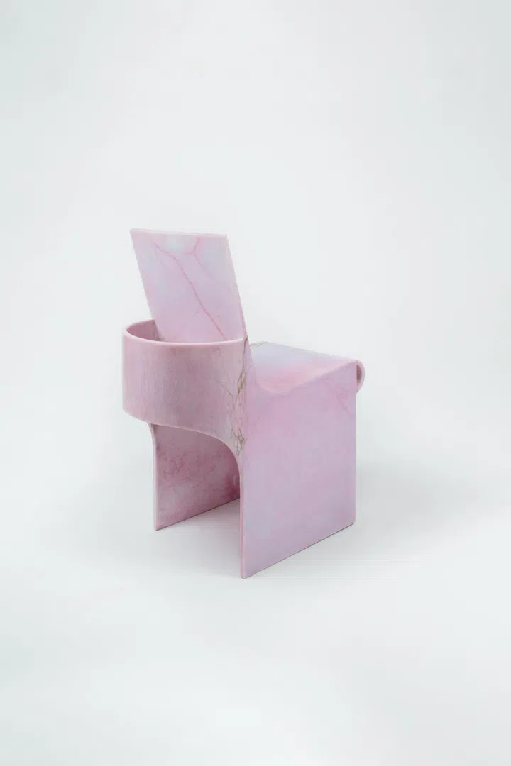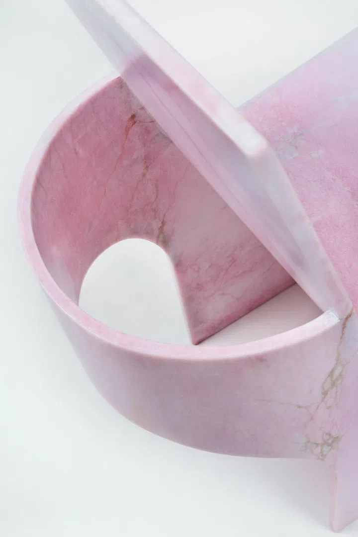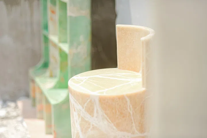Replete with graceful curves and a beguiling pastel colour palette, they make for a lovely sight to witness in person – closer to objet d'arts than furniture, one assumes they're fashioned out of marble upon first impressions. But then, how are the curves on say, the stand-out baby pink chair or the jade-green shelf achieved?