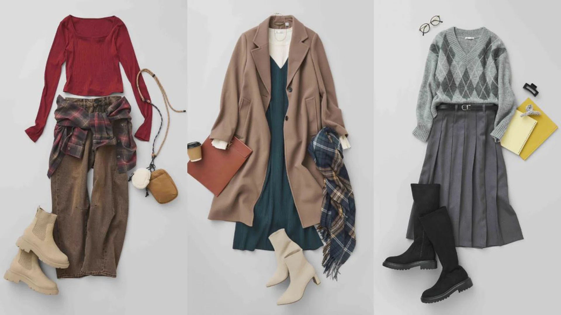 This pleated midi skirt is one of the many pieces at GU Japan that is made of recycled materials. Here it is matched with a cosy argyle-patterned sweater that’s been treated to feel comfortable against the skin; knee-high boots with a stretchy finish that wraps around the heel and arch for a second-skin feel; and a reversible belt that’s black on one side and silver on the other.