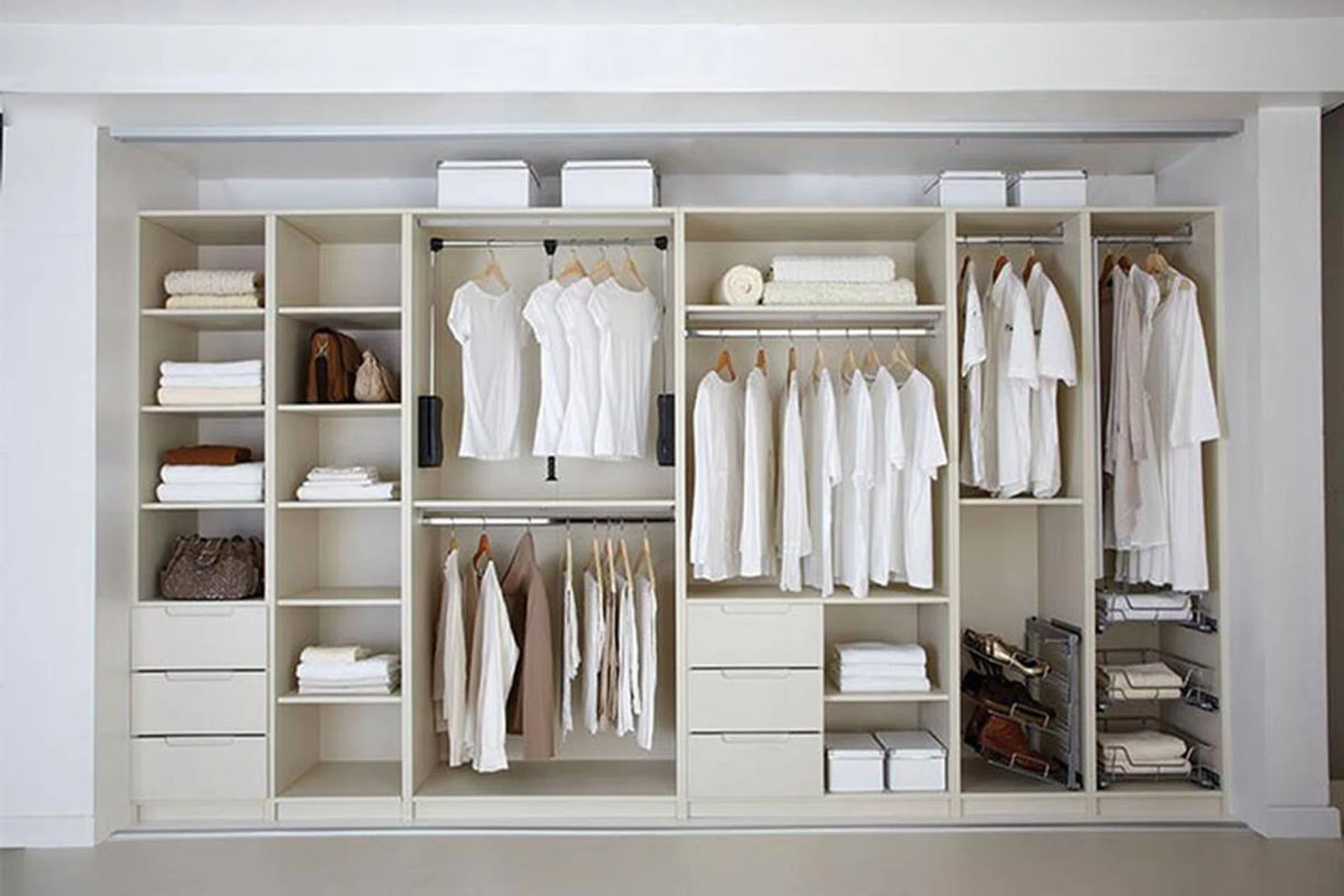 A nifty trick is to get the right kind of hangers for your wardrobe. Cascading hooks work for tall wardrobes as it can maximise vertical space, shallow hangers are a great help for wardrobes with little depth and super thin hangers will allow you to hang up more items.