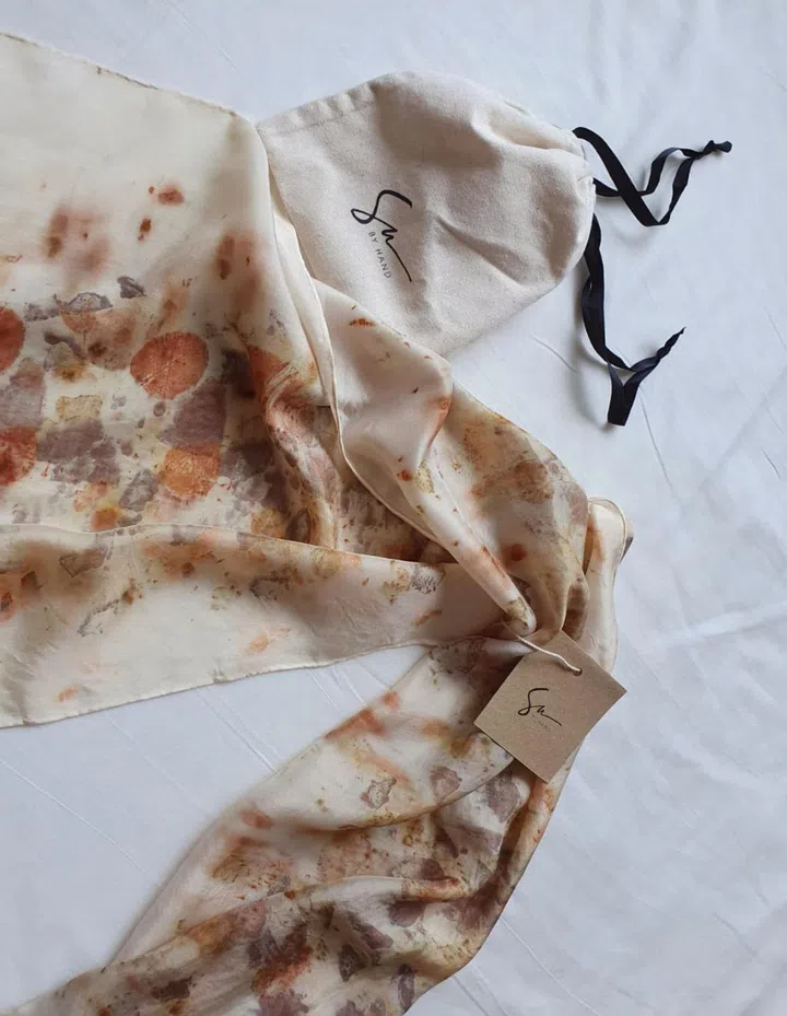 Techniques involved: “The one-off pieces involve eco-printing or hand-dyeing shibori techniques. With eco-printing, I print with plants and minerals (florals, leaves and mordants) directly on silk. With the hand-dyed pieces, I use natural plant dyes like avocado and pomegranate. Some of our plant-dyed silks were also sourced from Living Blue Bangladesh, a social enterprise that supports local indigo farmers and artisans.”