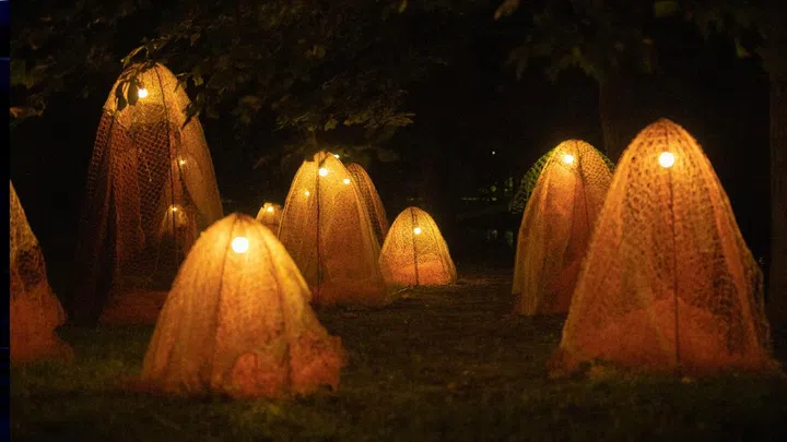 For example, Underworld (pictured) by Swedish artist Aleksandra Stratimirovic and Argentinian artist Leonel Kaplan depicts an imaginary undersea settlement with giant lanterns made of discarded fishing nets. Set against the backdrop of a soundscape featuring haunting echoes of the sea, the artwork calls attention to the fragility of our marine ecosystem.