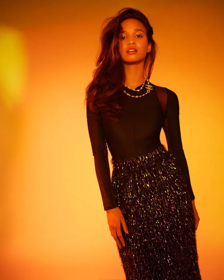 Muslin skirt and metal necklace with resin pearls. Bodysuit, Iman’s own