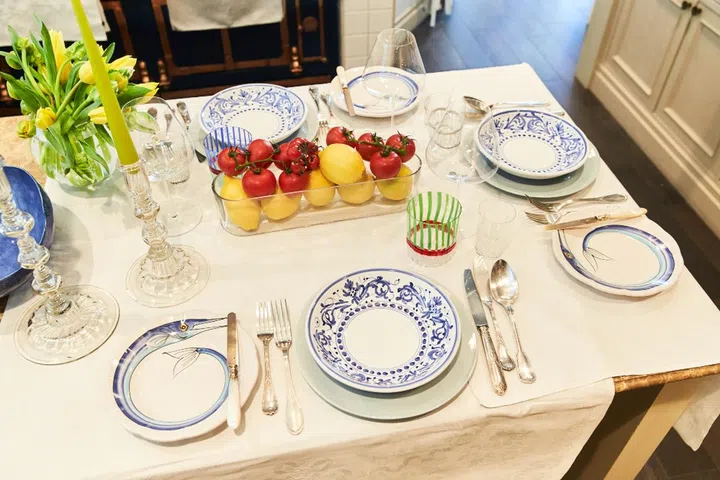 "Marie Daage and Laboratorio Paravicini for beautifully hand-painted dinnerware. Richard Ginori for classic white porcelain that nails elegance. Carlo Moretti for colourful Murano glasses that accentuate your table. Sabre, Paris for everyday casual flatware that is practical and chic. Ercuis and Christofle for over-the-top silverware. Julia B for bespoke, hand-embroidered linens meant for table, bed and bath."