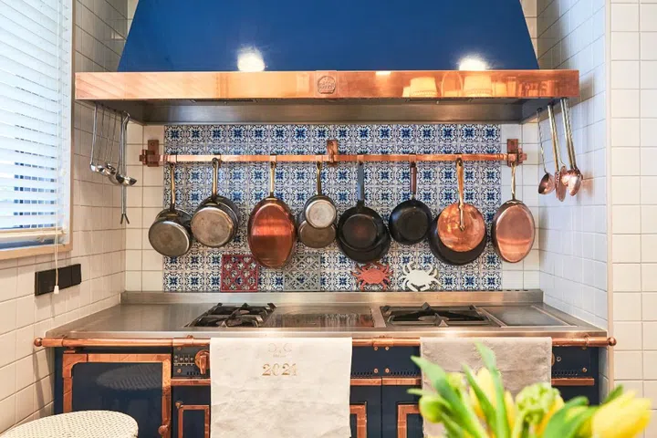 Her kitchen, with its homely blue and white tiles and copper-accented stove, is reminiscent of what you may find in charming country homes in the French and Italian countryside. “Since childhood, my family has spent a lot of time in Europe, especially in France and Italy, so when I designed my kitchen, I wanted to create a space that could transport me back to the European countryside and its comforting beauty," she says.