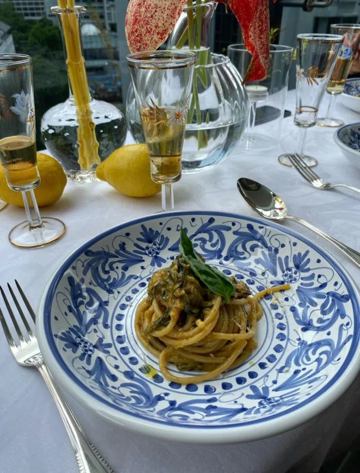 "Home has always been important. But in the absence of travel, home has become a vehicle for transporting us into different places and seasons. In the summer, I hosted a lunch at the terrace inspired by my travels to Capri, Italy. Starting with a plate of crudo, spaghetti alla nerano (summer zucchini pasta from the Nerano region), ravioli caprese, seabass aqua pazza and baba al rum set to a table of ocean blue and lemon yellow, with Tarantella Napoletana music in the background."