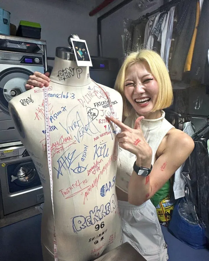 Ueno with the unofficial mascot of Lagoon Laundry the online radio show: a mannequin torso on which visiting DJs and their friends can scrawl their names.