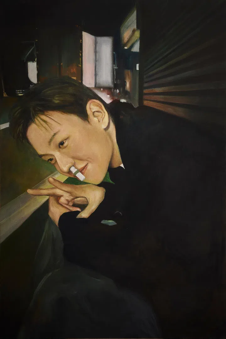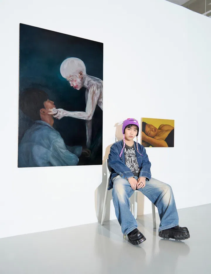 His practice in his own words: “I am a painter working with figurative works and various forms of visual storytelling. My art draws inspiration from muses and romance, focusing on the universal aspect of desire and the intricate dynamics of inter-human space and coexistence. Through my work, I aim to depict and examine human connections and shared experiences… While I don’t necessarily aim to create art specifically for social impact, perhaps my identity as a gay man has come to influence my work deeply. My pieces are blunt and often vulnerable, reflecting my personal experiences and emotions. Through my paintings, I hope to convey a sense of shared humanity and connection, allowing others who may feel similarly to see themselves in my work and feel understood.”