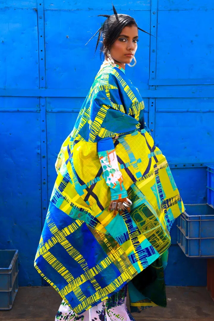 Introduce us to your final-year project: “My final year project is titled ODYSSEY. Inspired by what goes into the back of so many trucks in India, this collection is a satirical commentary on overconsumption and waste. I upcycled discarded saris to create pieces that can be draped onto the body in many ways not unlike a sari. Drawing references from the DIY attitude and anti-fashion aesthetic of the punk subculture and dadaist art movement, this collection offers interactive textiles that allow the wearer to experiment with assemblage. It also aims to be sustainable not only through my fabric choice, but also in my development of modular, versatile garments that wearers can keep for longer.”