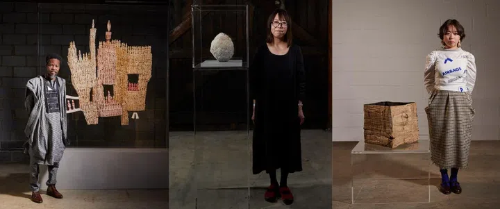 Winner of last year Loewe Foundation Craft Prize, Eriko Inazaki (pictured in the middle), as well as Special Mention awardees Dominique Zinkpe (left) and Moe Watanabe (right). Inazaki scooped the top gong for her detailed ceramic sculpture, which was created by accumulating tiny forms that come together on the artwork's crystallized surface.