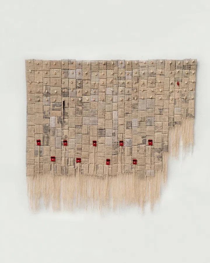 Ange Dakouo, Mali, ‘Harmony of Grigris’, cardboard, newspaper, cotton thread, acrylic and cowrie shell, 1630 x 1530 x 10 mm, 2023