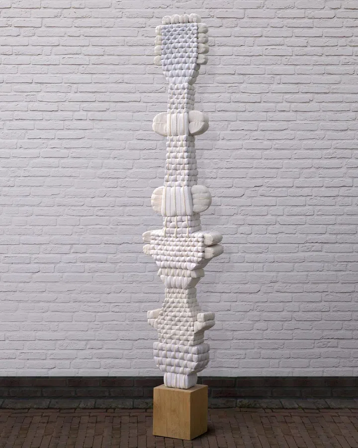 Saar Scheerlings, Netherlands, ‘Talisman Sculpture: The Column’, foam, old French linen, various yarns, oakwood and metal, 480 x 240 x 2450 mm, 2023