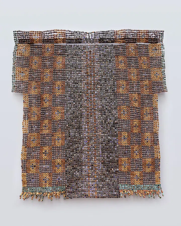Ozioma Onuzulike, Nigeria, ‘Embroidered Royal Jumper for Peter Obi’, clay, ash glaze, recycled glass, engobe and copper wire, 2240 x 2300 x 120 mm, 2023