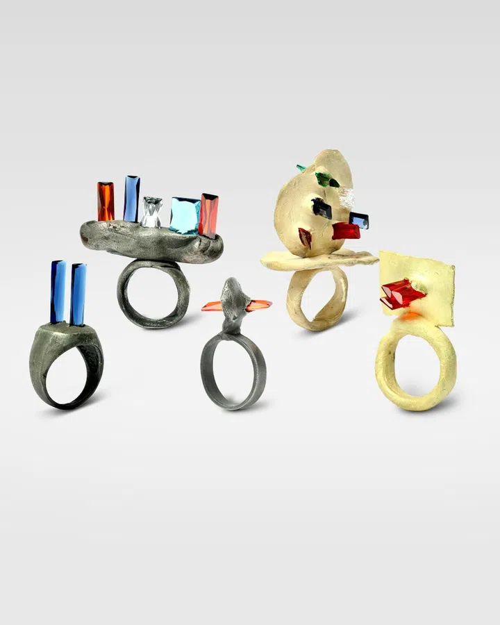 Karl Fritsch, New Zealand, 'Pukana’, silver, gold and synthetic gemstones, various dimensions, 2020