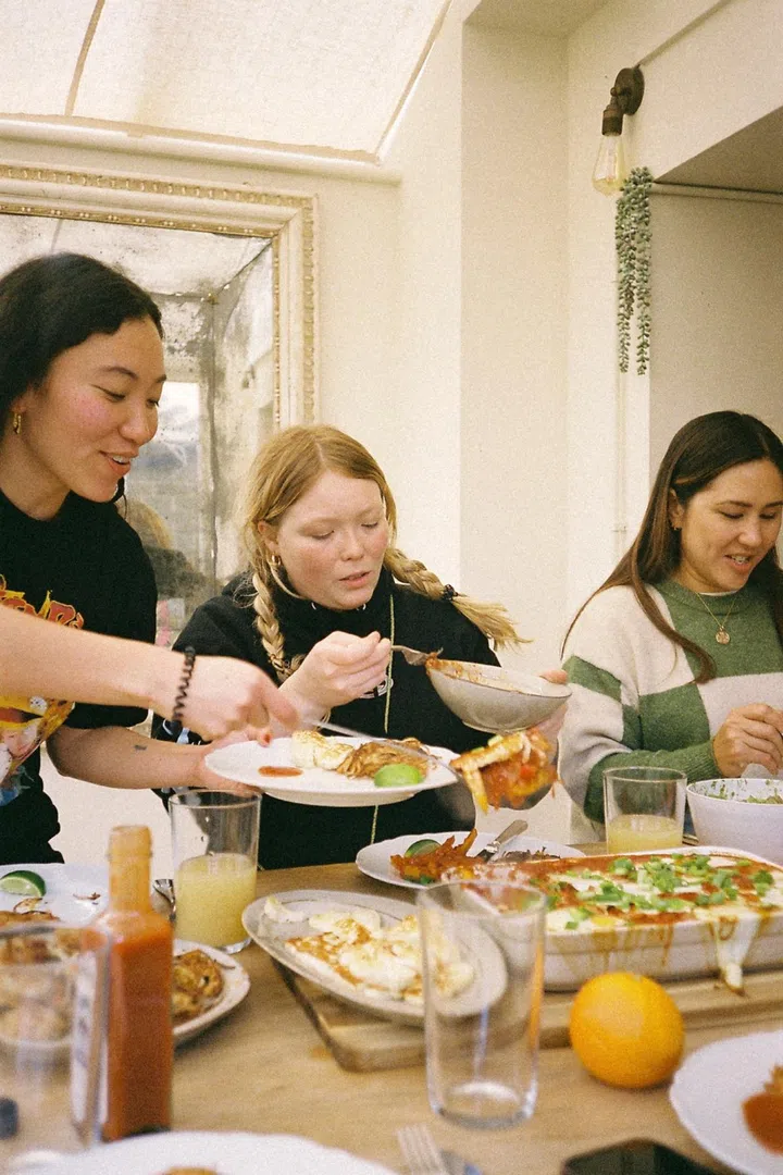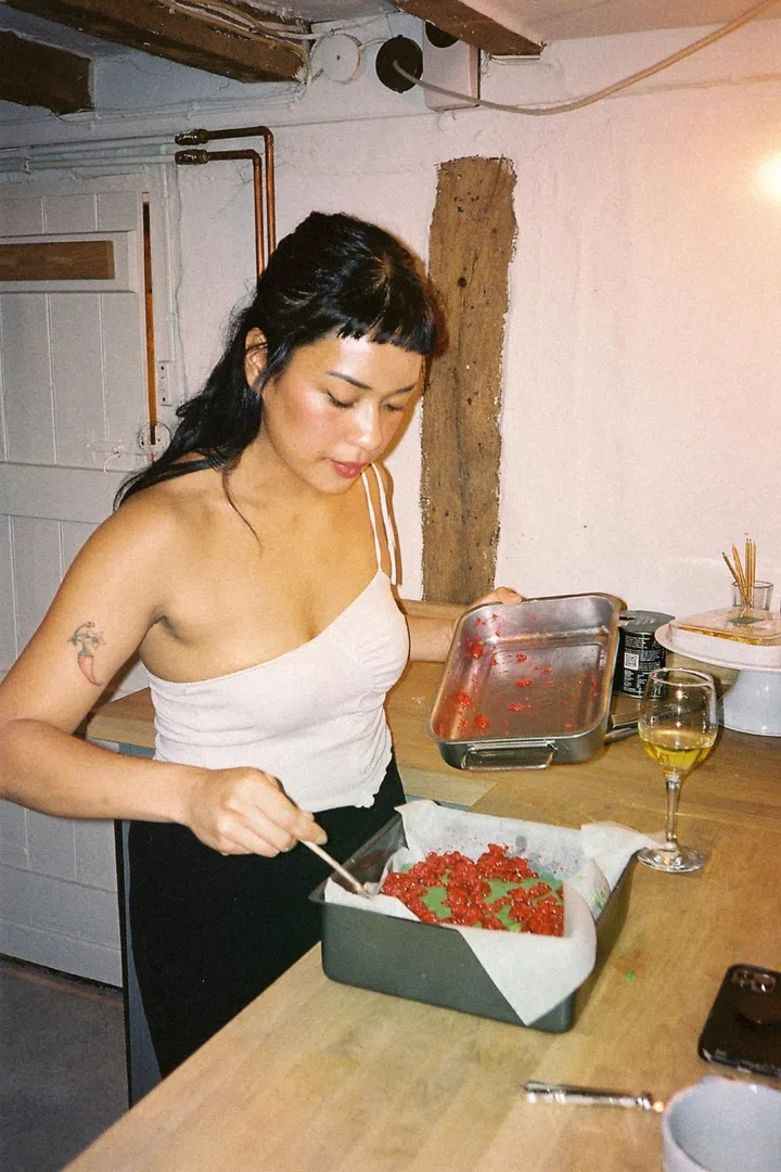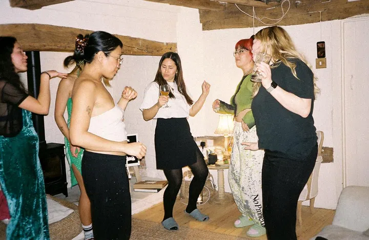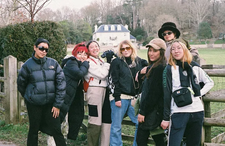 A group portrait of Hidhir Badaruddin (with camera) and his "Slaysians" in his London apartment. Clockwise from bottom left: Seoul‑born DJ, radio broadcaster and podcaster Oh Annie Oh; Indonesian chef, entrepreneur and food writer Rahel Stephanie; Hong Kong‑born artist Nicole Chui, who also co‑founded Baesianz FC, a football team for women, trans and non‑binary people of Asian heritage; DJ Elaine Zhao, who grew up in Hong Kong and is a promoter at Eastern Margins, a UK‑based music platform highlighting East and Southeast Asian talents; and freelance art director and writer Jyni Ong – a first‑generation Brit whose parents hail from Malaysia