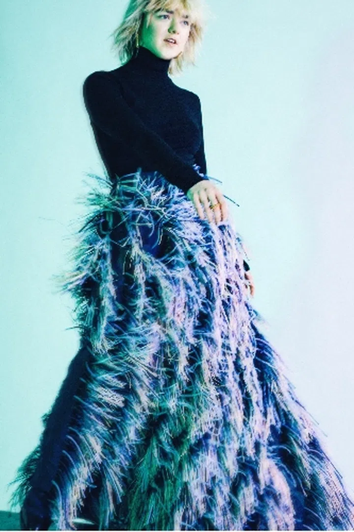 Wool-blend turtleneck sweater and organza skirt with feathers, Givenchy. Clash de Cartier pink gold earrings and matching ring, Cartier