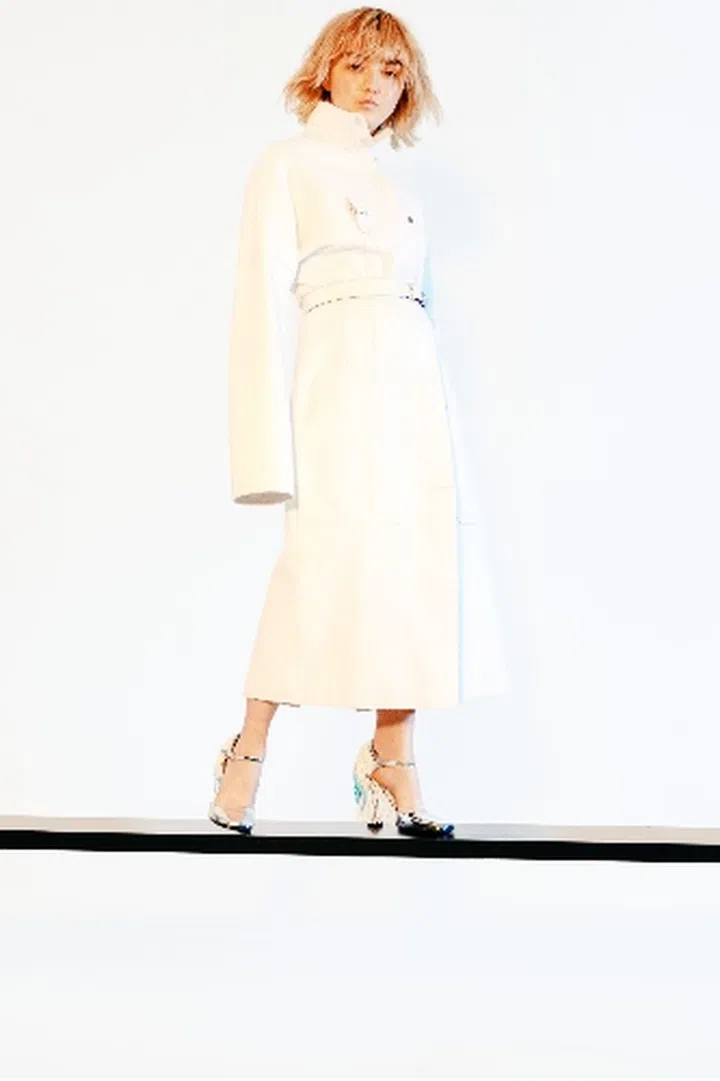 Leather trench coat and matching belt, Hermes. Clash de Cartier pink gold earrings, Juste un Clou rings in pink and yellow gold, and Pasha de Cartier 41mm yellow gold watch with sapphire on leather strap, Cartier. Leather pumps, Prada