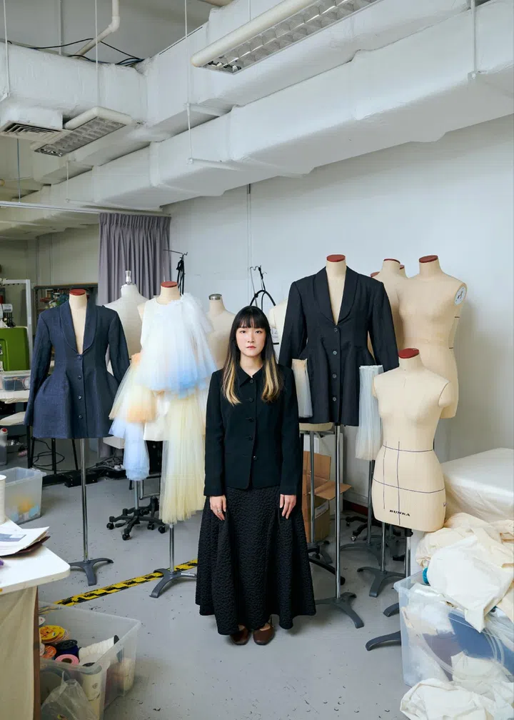 ON HER FYP: “The project began with the question: How do we instil memories into garments? A few weeks into the project, my maternal grandmother – who had lived with me for the past thirty years – passed away. I was plunged into the depths of grief. In mourning, I explored the internal-to-external process through blind drawing and blind draping, a technique developed by my lecturer Lidya Chrisfens. This led to further experimentation in pattern-cutting, draping, and soft tailoring. The resulting womenswear collection, In Memory, is a physical manifestation of introspection, an ode to my late grandmother, and a tribute to love and loss. It is a framed memory – expressed through garments.”