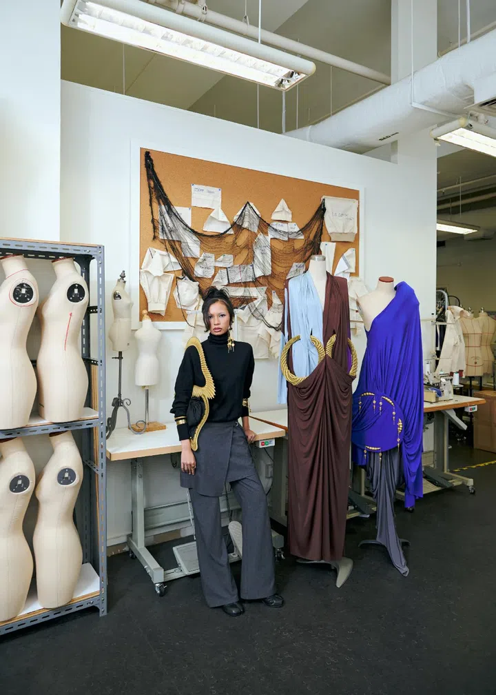 WHAT DREW HIM TO HIS DISCIPLINE: “I’ve always been drawn to the craftsmanship and details that go into well‑made fashion pieces. They’re akin to art and made me want to understand how they’re created. Having a mum who’s an artist has also made me feel more sure about choosing to follow my passion – I’d already taken the practical route by studying business for my diploma and realised it wasn’t what I wanted for my future.”