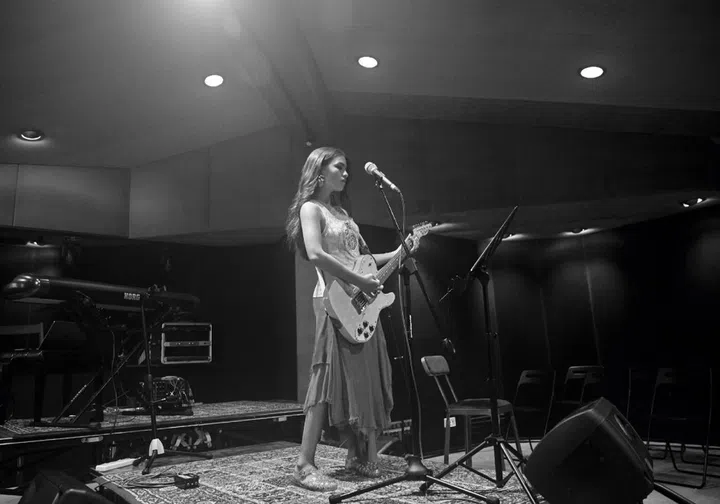 Mila Bea warms up for her fourth solo (and sold‑out) gig at the legendary Lion Studios – reportedly Singapore’s oldest recording studio – in early December last year. Exposed to a wide range of music from a young age, she counts Laufey, Phoebe Bridgers and Joni Mitchell among her idols.