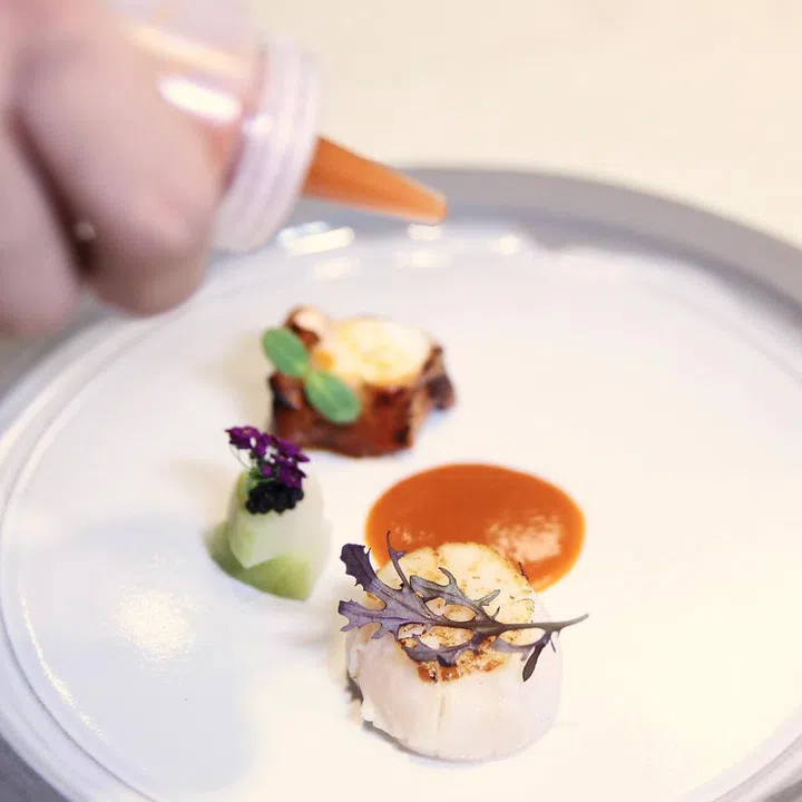 Chef-owner Michael Wilson celebrates spring in this pretty spot in Gardens by the Bay. The meal starts with snacks like Kingfish and Caviar (algae tart shell, aged kingfish, smoked cream, Amur caviar) and Apricot and Comte 36 ( apricot ‘leather’, 36-month aged comte cheese, gel of sauternes). If you’re brave, a lunch-exclusive dish to tuck into is the Domaine St. Vincent asparagus, rolled in a confit egg yolk emulsion and black ants. The insects, included for acidity, are farmed for culinary use in Massachusetts. On the side: charred kale, wild garlic puree, buttermilk sauce and wild garlic oil. Another highlight is the slow-cooked Iberian suckling pig, served with savoy cabbage puree and chou farci. Finish with a pretty dessert of caramelised homemade brioche soaked in a tonka bean-infused, alongside Tonka bean crème diplomat and crowned with strawberries.