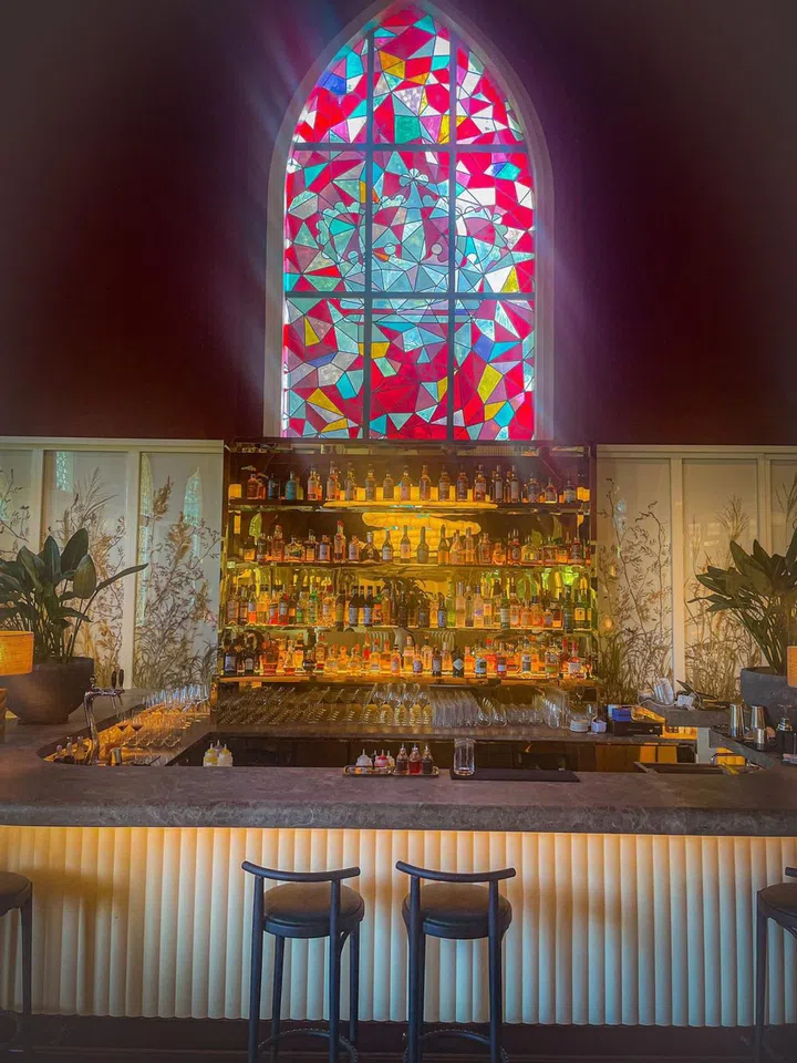 Original elements such as the stained glass window have been preserved – it is now an eye-catching centrepiece above the bar.