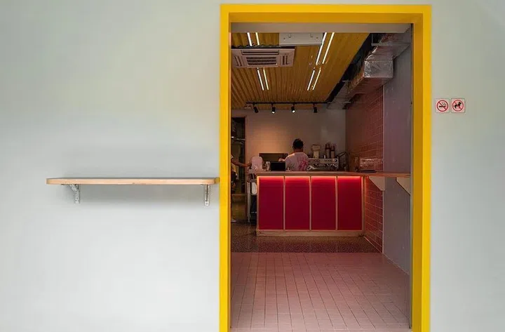 We’re also loving the laid-back decor in the small space, featuring retro pink tiles, neon lights and granite flooring.