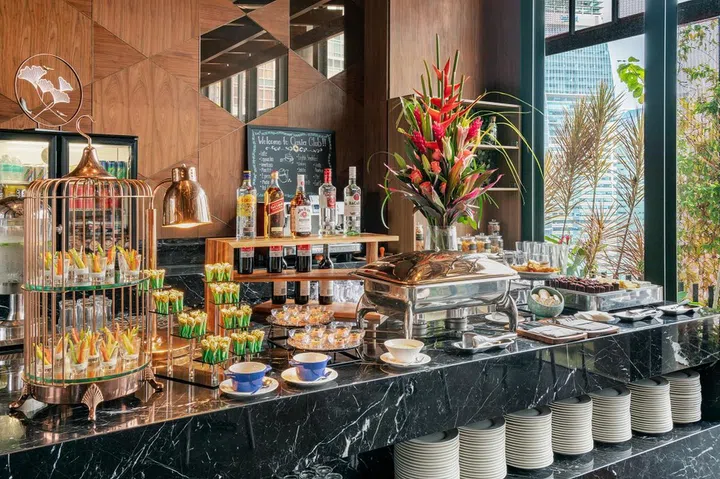 Indulge in a curated spread of gourmet bites and refreshing drinks at the Club Lounge.