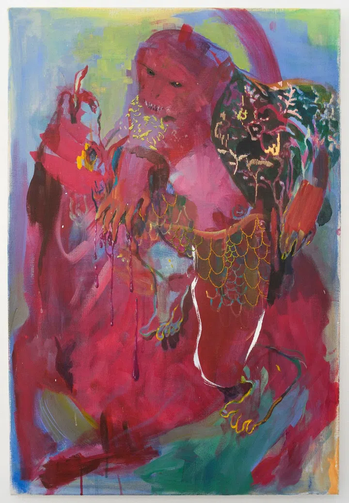 "I see my practice as reinvented cosmology, pieced together from threads of inherited story and autobiographical fragments. Drawing on motifs from Chinese mythology and Buddhist iconography (pictured is her reimagination of Chinese mythological figure Niu Mo Wang), I use the familiar visual language of folklore to examine and subvert conventional archetypes of femininity, queerness, and otherness. Inherited stories are vessels that encode both the values and repressed desires of our times, and so endlessly interesting to me as source material to prod at, rearrange, and recontextualize.