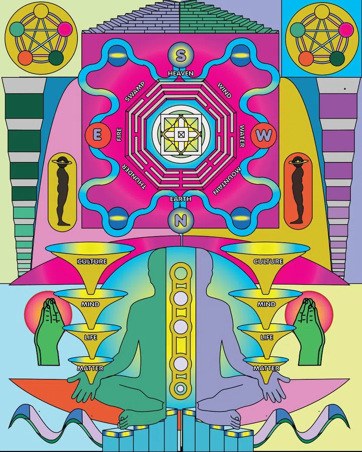 "My artwork is mostly dreamy and has signs of mystical and spiritual associations in a technicolour dreamscape (see the piece Sequence of An Early Heaven above). My intentions are always to spread positivity through imagery. Cryptic messages and sacred motifs are often sublimated within the bright and positive works. With a hint of the spiritual about them too, they push the viewer in their relationship with the work, prompting them to 'dare to dream' by contemplating the contemporary mystic scapes.