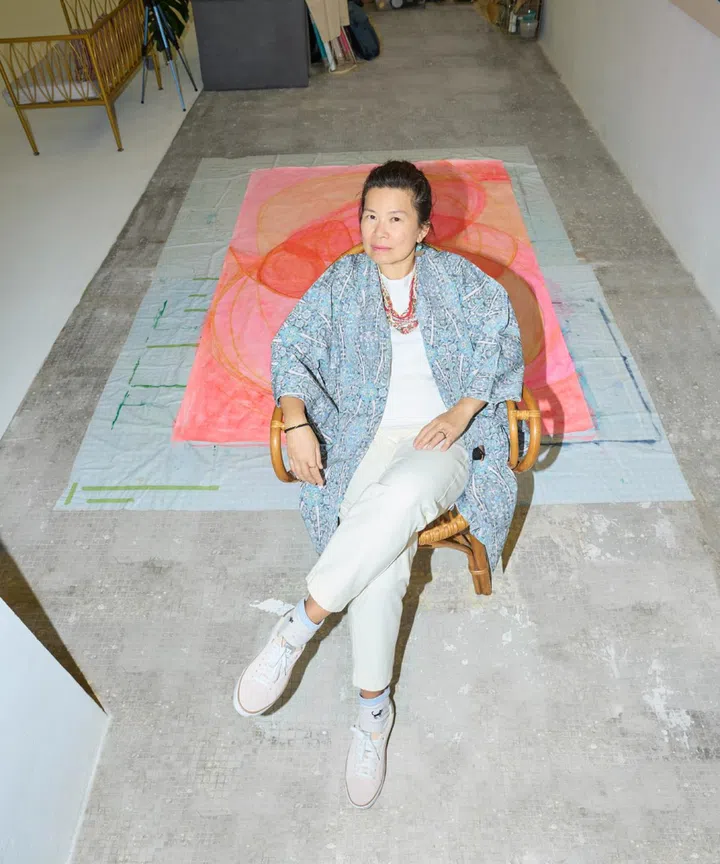 What she does: This self-taught, Malaysian-born abstract painter and part-time accountant began her art career in 2020 right smack during the pandemic. Her style might be best described as soothing and minimalist – she favours a monochromatic or analogous colour palette and tends to incorporate elements of movement and somatic healing. Her 1,500 sq ft unit at Peace Centre – once the storeroom of a music store – provides her with the space and opportunity to explore larger scale paintings and installations such as the one on the floor pictured here in portrait. It’s just one in a series of large canvas paintings she’s titled A Walk with the Sun and her goal is to have the entire set ready before the Peace Centre calls it a day at the end of January.