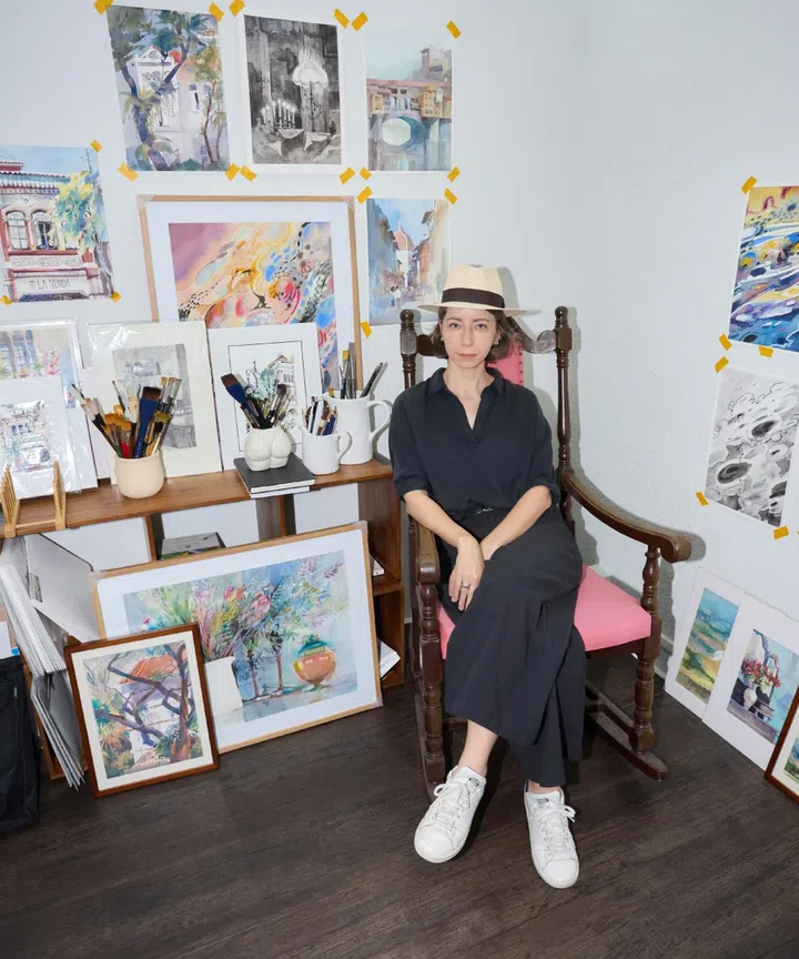 What she does: This former interior designer from Russia who’s called Singapore home for the past eight years made the transition to a full-time professional artist in November 2022. Her specialty: tranquil watercolour paintings of scenic locations created mostly en plein air (read: on location). Her Peace Centre residency – taking over a space that was formerly a massage parlour – marks her first studio outside of home, offering the public a glimpse of what’s usually a private, closed-door affair. Thanks to PlayPan, she’s also embarked on her first mural.