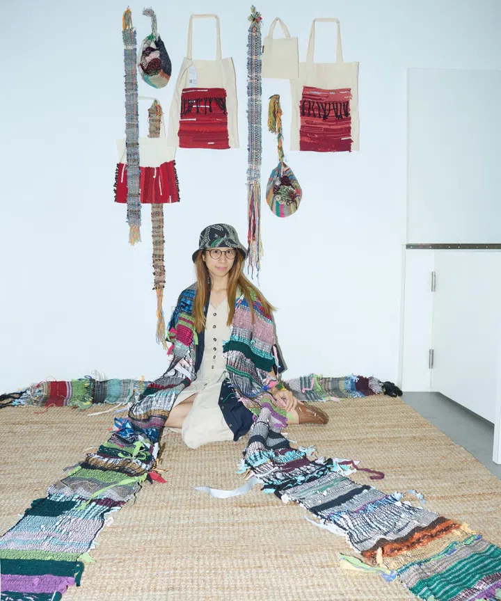 What she does: Using primarily the Japanese craft of Saori weaving, which is celebrated for its irregularity and “unprogrammed beauty”, this 32-year-old transforms salvaged textiles and unwanted fabrics into colourful, large-scale installations that have earned her commissions from the likes of Diptyque. During her stint at Peace Centre, where she’s takenover a space that was formerly the office of a licensed moneylender, she’s handcrafted a thousand knots for peace – a series of braids measuring a total of one kilometre – that now drapes across the ceiling of the luxury fragrance maker’s Ion Orchard boutique. She also describes herself as a “community artist” as she often invites others to join her in the weaving process, giving others the chance to play artist too. Clock ties that bind, a massive curtain that cascades down the atrium of Peace Centre from the second floor – a work she co-created with the attendees of the community event Groundup Day 2023 held on site last August using discarded fabrics from eco-fashion operations Cloop, The Fashion Pulpit and Re-Store.