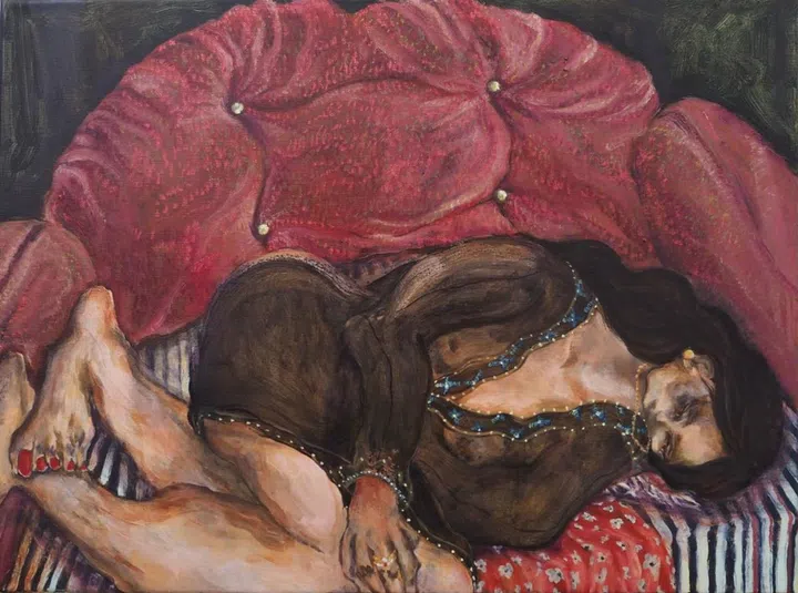 Chinese artist Xu Yang's candy-coloured, 18th-century Roccoco painting-inspired fantasy, on the other hand, are a response to her personal history of growing up in China, where self-expression has always been heavily controlled and monitored. She migrated to England to study arts and there, the artist found solace in the London drag community which encouraged and celebrated self-expression. Freedom of expression takes the form of constructed identities, pink unicorns and lavish dresses in Xu Yang’s paintings as a way to reposition women’s bodies away from the male gaze and to challenge and rattle the social order.