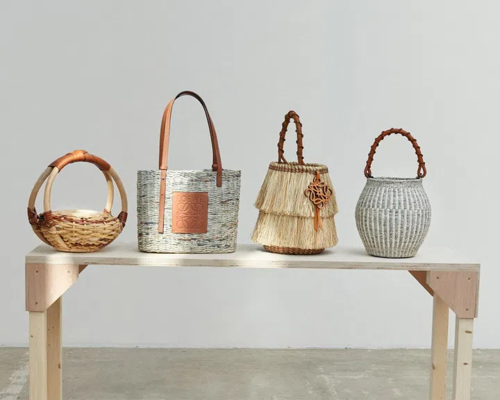 Loewe gave 240 existing baskets sourced from all over the world to artisans Idoia Cuesta, Belen Martinez, Santiago Besteiro, Juan Manuel Marcilla. They then mended and repaired them using leather strings and the result is a series of unique baskets that are a testament to invention, and very playful and surprising for that. "Authentic craft, for me, is sustainable: the concept of repair is fundamental in this sense," says creative director Jonathan Anderson.