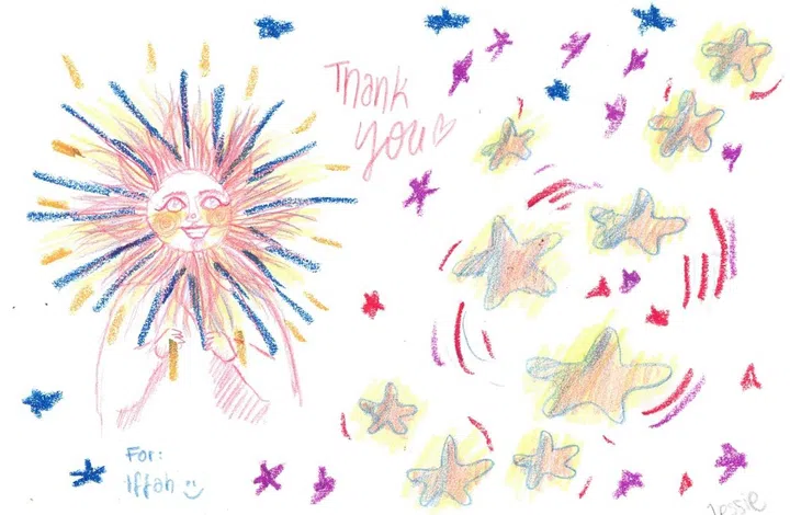 “The atmosphere at Senisini’s sessions are incredibly homey and welcoming. Events like these – where people come together out of a love to create art – are so rare and the fact that they’re free makes it even more amazing. I especially loved meeting Iffah. When she introduced herself and spoke about Senisini, she absolutely lit up – her warm smile and the intensity in her eyes making it clear how much this means to her. That was why I ended up drawing the sun – even if it turned out a little ugly. To me, Iffah embodies radiance and the event left me feeling like one of the dancing stars in my drawing here: hopeful and optimistic about the art scene in Singapore.”