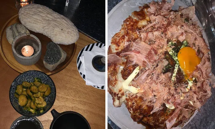 THE SIGNATURE DISH: A full-course round of Kyuri, Sari Gowari Morohaku Sake and Okonomiyaki KD from Katong Diner.