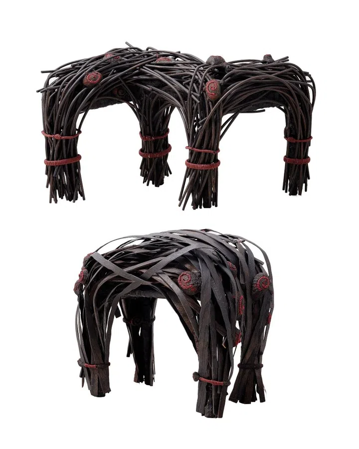 Somyeong Lee, Republic of Korea, ‘Chronicle of Matter’, 2025, comprised of ‘Chronicle of Matter 001’ and ‘Chronicle of Matter 002’,steam-bending oak, ocher, rope and mixed media, 600 × 1100 × 550 mm