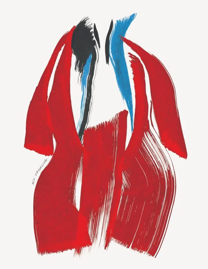 The artist/illustrator’s “look” of choice was Balenciaga’s monstrous swing coat made up of multiple outers that had been fused together, yet the result has a romantic painterly quality reminiscent of early 20th century fashion illustrations. Her raw, expressive strokes feel modern in their minimalism, but the 27-year-old admits to also being influenced by time-honoured crafts like East Asian calligraphy. “I like traditional mediums for their humanity and imperfection,” she says. “I’m most attracted to wet mediums (such as gouache) because of their unpredictability. I never know how a painting will turn out, and I don’t sketch before I paint because the lines are restrictive.”