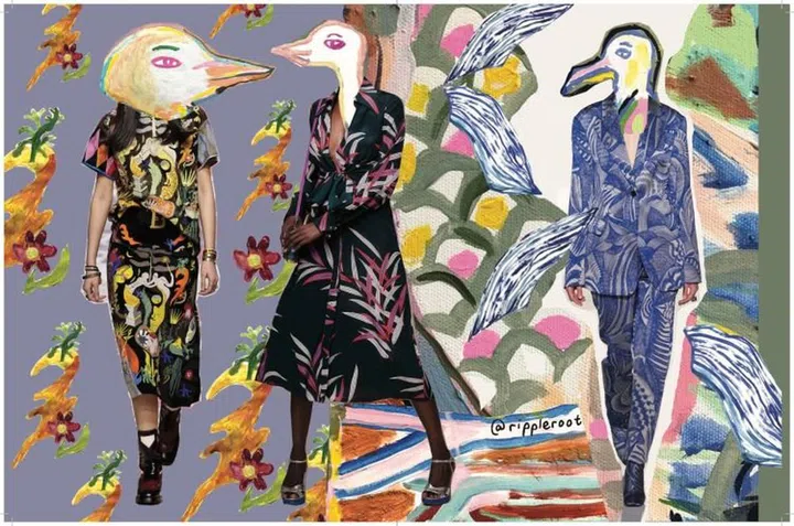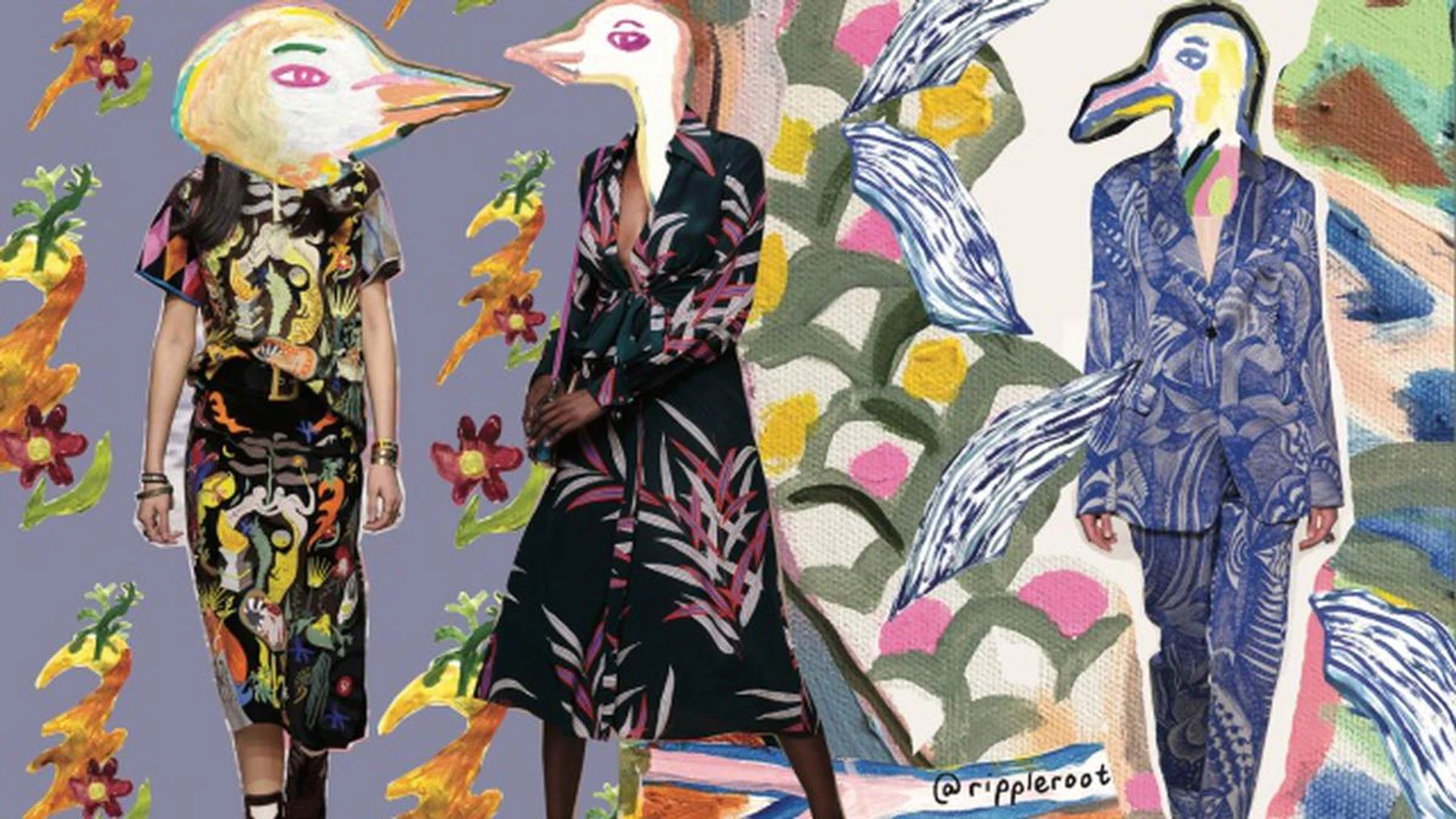 And while their love for Matisse, South-east Asian art and primitive folk patterns is apparent in their work, their frenetic lines, playfully abstract figures and bold use of colour lend an effervescent spirit that would make the Instagram-happy, well, very happy. “There’s always a tongue-in-cheek quality. Even when we make ‘serious’ art, we want the viewer to experience the same joy we encounter in the creation process. Art should be uplifting,” says Ng. Describing their aesthetic as “swamp life poetry”, they’re big on flora and fauna, which was why we thought it apt for them to interpret the botanical prints of (from left) Dior, Diane von Furstenberg and Dries van Noten. True to their whimsical nature, the duo — who are in talks with a Sydney-based institution for a show early next year — turned the runway models into birds. Says Liew: “Art/design doesn’t have to fit a set ideal or have a defined look. We like being fluid, and we go by our own rules.”
