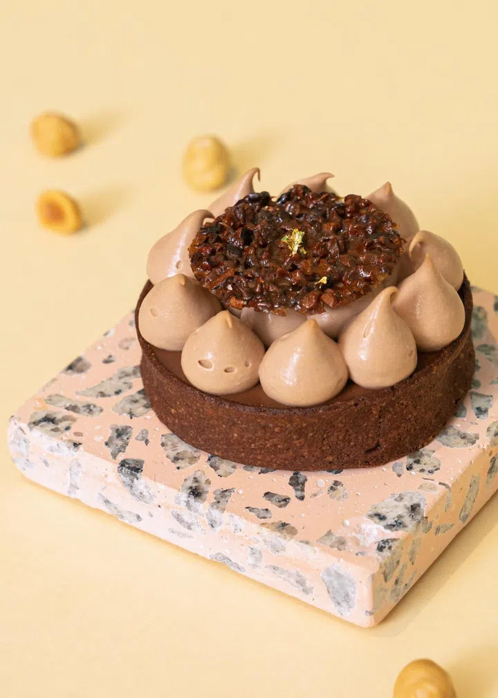 My first experience with hazelnut praline was a jar of hazelnut butter that my mother brought back from her travels in France. This has translated to my Chocolate Hazelnut Tart (pictured) where every single-serve tart has a spoonful of homemade piedmont hazelnut praline at the base that oozes out when cut. With my savoury food, a lot of it was inspired by the Peranakan and Eurasian food that we see on our dinner table at home. This reflected very evidently in my Curry Captain Sausage Rolls, which appeared in my very first bake box with Tigerlily.”