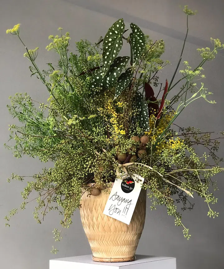 Special V-Day designs: Embracing the theme Bursting with Sayang for Valentine’s Day 2024, Kebun Ijo Flowers presents an arrangement featuring an effervescent blend of eucalyptus berries, field pennycress, ammi majus, mimosa, begonia maculata, and dimocarpus longans – all elegantly corralled within a huad (a bamboo steamer from Thailand). The dimensions of the arrangement are 90 x 90cm, and exact ingredients and materials may vary.