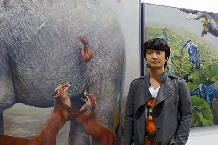 In April, Gucci approached him for the second instalment of Guccigram, creative director Alessandro Michele’s brainchild that sees artists reinterpret the brand’s Oriental bird and floral Tian motif into an original work for Instagram. One of 24 Asian names commissioned, he deftly swopped his usual modus operandi – slow oil-on-linen paintings that can take up to six months to complete, if you include drying time – for digital tools. The result: a surrealist image of a sulking schoolboy with the incongruous head of a gorilla set against the Tian pattern – a hip and hyper Rene Magritte painting, if you will.