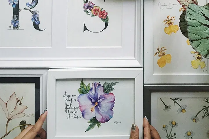 Taking her obsession further, she’s became a certified florist to get a better understanding of blooms. She also often includes the plant’s scientific name on each work in an elegant, vintage-inspired script – a nod to scientific drawings by 19th century naturalists like Alfred Russel Wallace. While a single illustration can take weeks to complete (everything is by hand), she enjoys the anti-digital approach, and even conducts classes at her year-old studio Within in Little India (22 Rowell Road).
