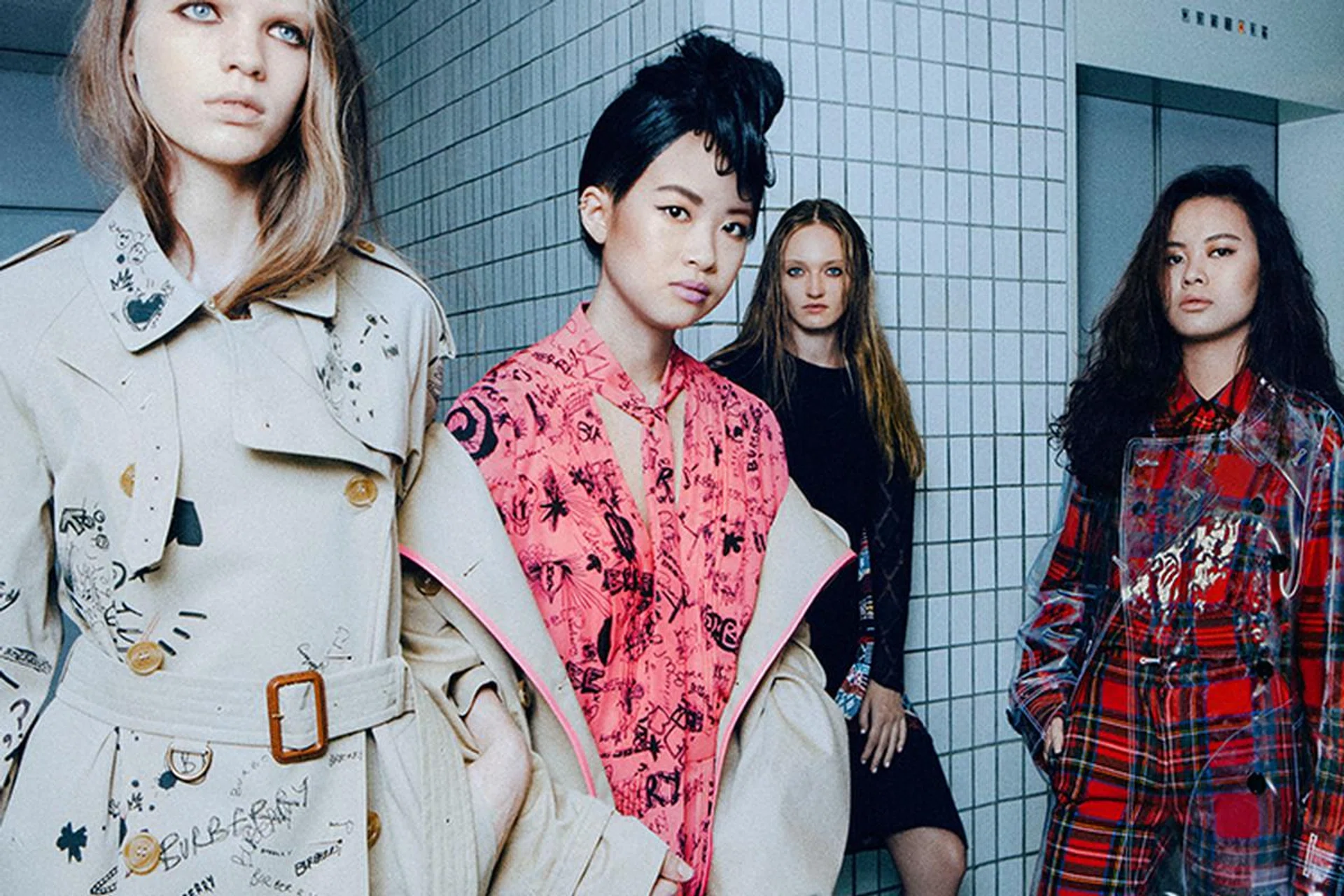 From left: Printed cotton gabardine trenchcoat; cotton gabardine trenchcoat and printed silk dress; wool dress; plastic trenchcoat, tartan wool shirt and matching pants