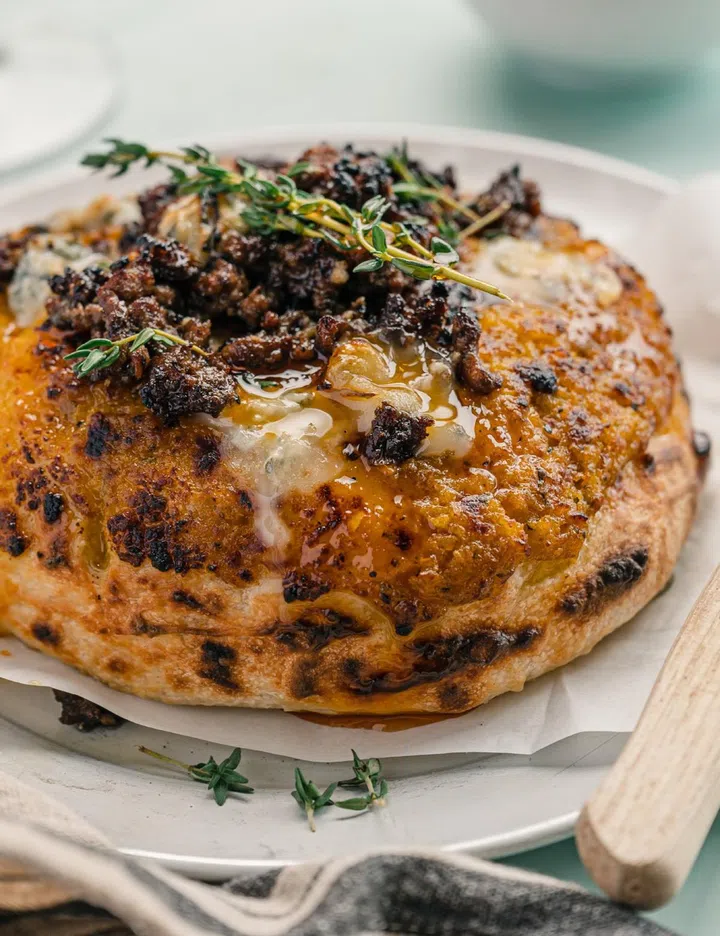 Bread: "This bread (pictured) is made from dough that has been fermented for 72 hours and uses a five-year-old starter, pumpkin pesto that's been fermented for 75 days, crispy wagyu beef, Gorgonzola cheese sauce and chilli oil."